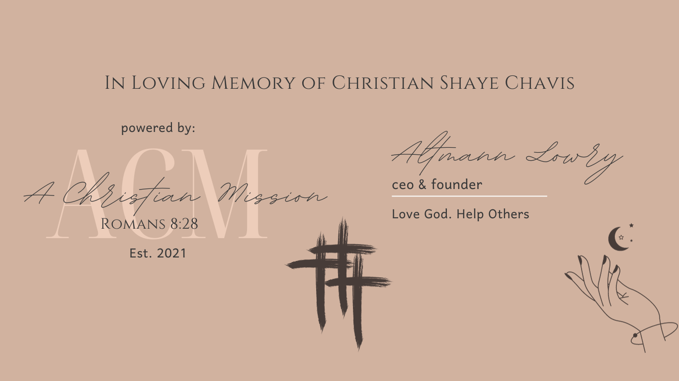 Experience the Perfect Blend of Faith and Fashion with Our One of a Kind, Handcrafted T-shirts That Were Designed with You in Mind. Our purpose for "A Christian Mission" Is To Go Out and Tell the World about Our Lord and Savior Jesus Christ Through Our Service - To and For - Others While Also Remembering & Honoring The Life, Love, & Lessons Left Behind of Christian Shaye Chavis. Gone Too Soon & Never Forgotten.